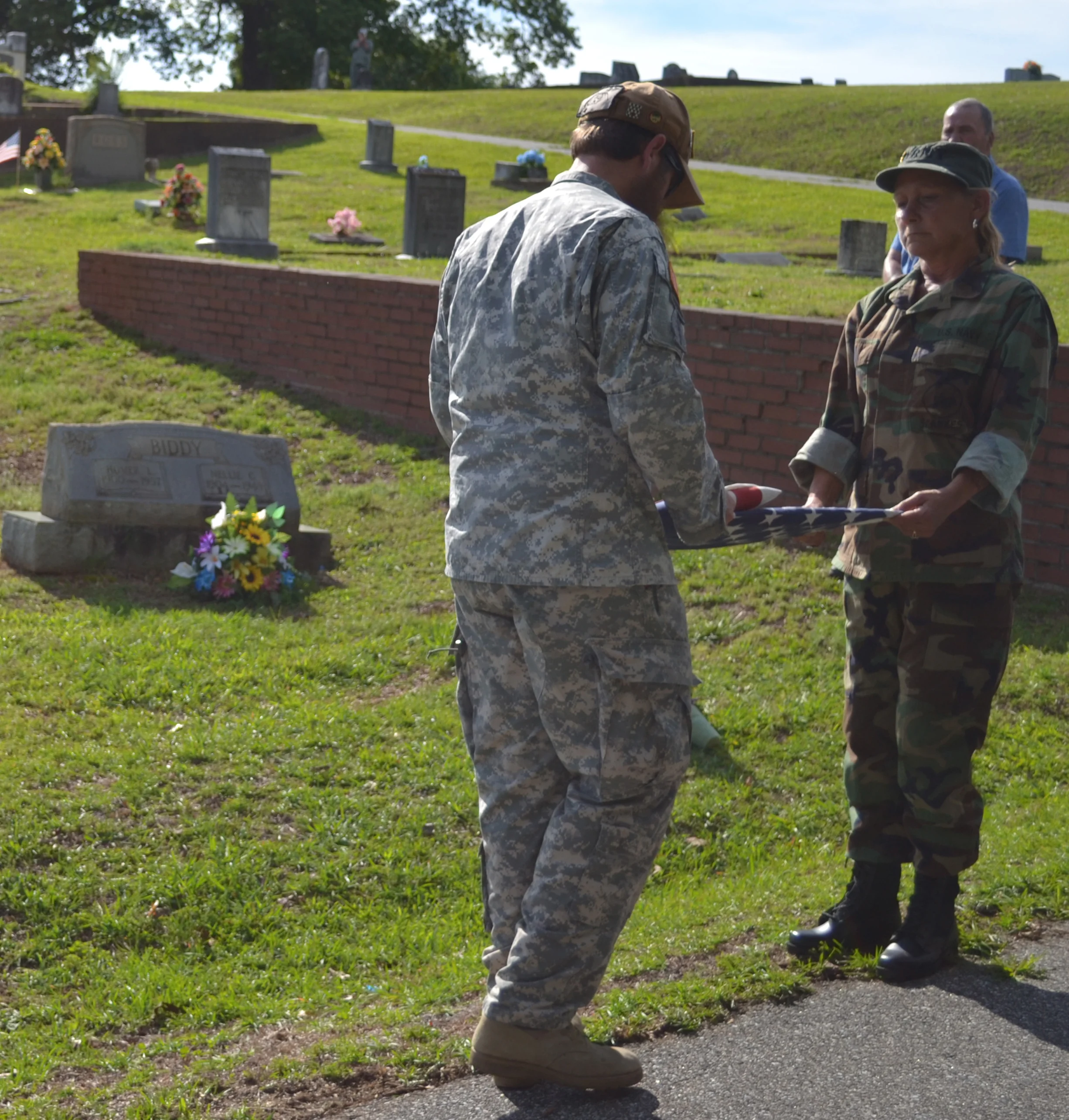 Brenda Cole is presented the flag by saluting Army Veteran Brandon Stowe, at Oak Hill Cemetery. Cole is the sister of Franklin "Cowboy"Eugene Biddy, who died in November, 2016, and was an Army Veteran. Cole, brother of Carl Biddy and members of the Fort Villanow Veterans Project, held a ceremony at the cemetery to honor Biddy. Taps was performed and a marker was put on Biddy's grave.