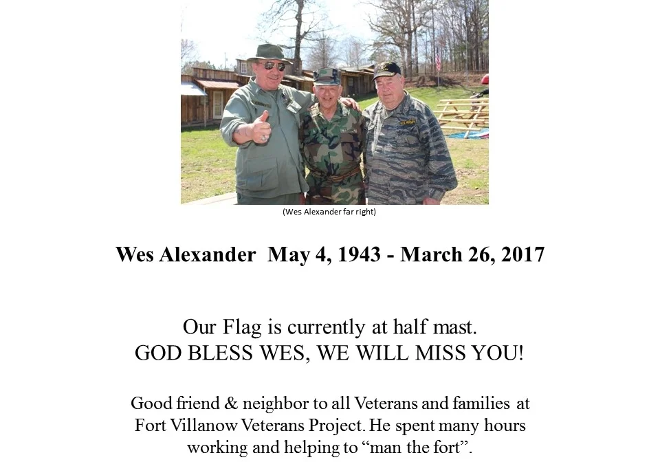 March 28, 2017 Fort Villanow RIP Wes Alexander March 28, 2017 Fort Villanow For more information on funeral arrangements please click here. Fort Villanow